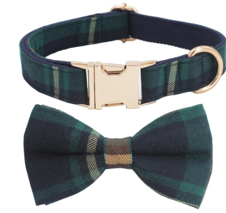 the collar made from 100% cotton fabric shell ,sewing over heavy webbing for durability and comfortable fit . bow tie ,collar and matching leash , the bow tie is removable, slides on or off easily it made by hand with high quality silver metal buckle, it is quick release buckle so they are easy to get on and off . Silver D-ring leash attachment . we care about every details .all fixing points are sewn times to make your collar as secure as possible